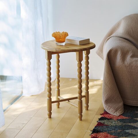 玉が連なったようなくり脚のフォルムが、優美で洗練された佇まい。サイドテーブルとしてはもちろん、玄関やコーナーを彩る台として、空間にアクセントを添えます。
