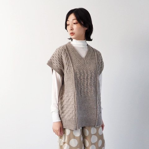 異なる編み柄を組み合わせた立体感のあるデザインで、表情豊かに仕上げたベストです。