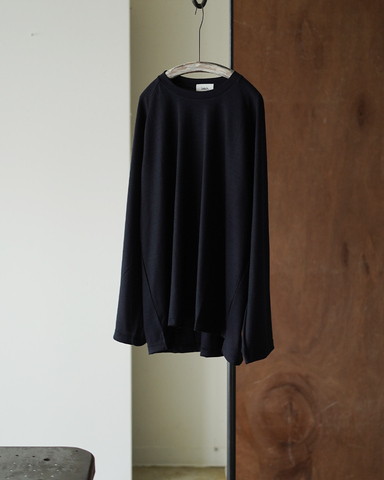 また、裾の短いスリットと前後差、ラグランスリーブが自然なドレープを生み、ベーシックでありながら存在感を放ちます。