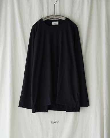豪州産メリノウール100%(Super100’s相当)を尾州で紡績し、微光沢を帯びた柔らかな天竺に編み上げた一枚です。