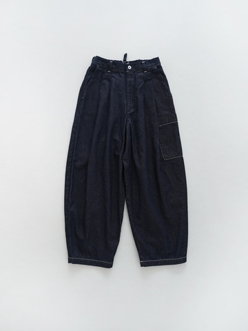 オールシーズン着まわせる厚みの、10ozデニム。膝下にゆとりを持たせ、裾が少しすぼまるダイヤのようなシルエットです。生地の分量を調節することで、ゆったり履けるけれど膨らみすぎない、絶妙なボリューム感に。前・横・後ろどこから見てもキレイなかたちで、コーデに取り入れると一気にお洒落な雰囲気になります◎