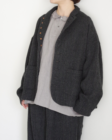 たくさん並んだボタンと立体的なシルエット、ウールヘリンボン地がヴィンテージ感あるオーバージャケットです。