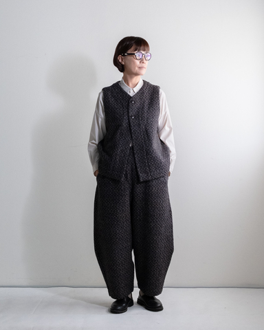 さまざまな色が織り込まれた生地は、どんなお洋服にも馴染みやすく、日々の装いに深みのある印象を添えてくれます。