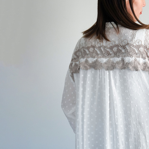 ドット模様のコットンドビー生地は、やわらかくほどよい透け感があり、春先から暑い季節まで快適。1枚ではもちろん、重ね着でも楽しめる、季節をまたいで活躍する一着です。