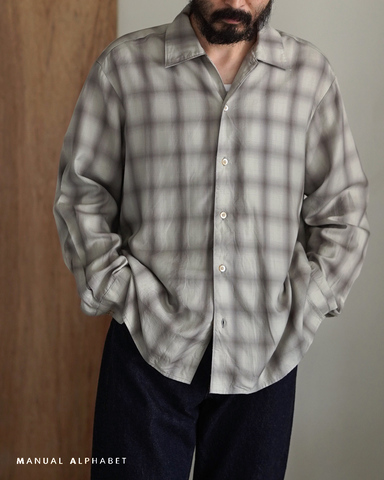 柔らかなドレープが生み出す陰影と、落ち着いたトーンのフェードチェックが上品な印象を演出。スクエア型のワンナップカラーは、ボタンを留めれば端正に、開ければオープンカラーとしてリラックスした雰囲気に。