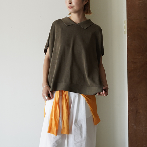 ポンチョのようなゆとりを持たせたシルエットで、身体のラインを拾わずに美しく見せるバランス。ホールガーメント製法で仕立てることで、縫い目のない滑らかな肌あたりを実現しています。