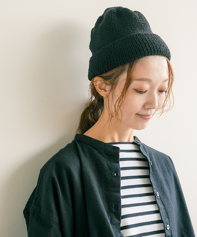 高さがやや浅めのショートモデルのニットキャップで、コンパクトなサイズ感ですので、普段のコーディネートにスッと馴染みやすく、スッキリと被っていただけます。