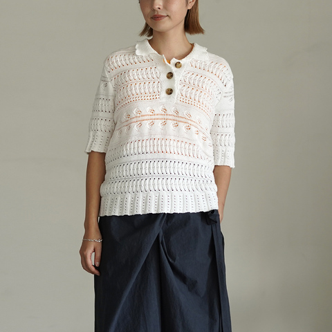 1900年代初頭、フランスのベッドカバーに見られるアンティークの編み模様をモチーフに仕立てたクロシェスタイルのポロニット。ハイゲージの強撚コットン糸を撚り合わせて編み立て、通気性に優れた軽やかな仕上がりです。