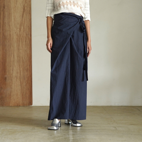フリーサイズ仕様で、タイパンツのようにウエストを結んでシルエットを調整できるのが特徴です。後ろヨークにはギャザーを寄せ、ヒップラインに自然なゆとりを持たせることで、動きやすく体型を美しく見せてくれます。