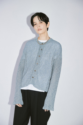通気性に優れ、季節の変わり目にも心地よく着用できるのも魅力。異素材をバランスよくミックスすることで、表面にはほのかな光沢と立体感が生まれ、シンプルながらも奥行きのある表情に仕上がっています。カジュアルにもきれいめにも馴染む、素材の良さが際立つニットカーディガンです。