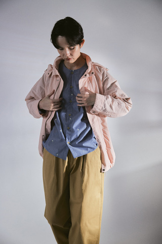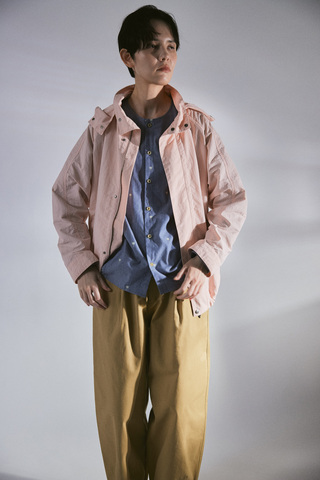 微撥水加工が施されたナイロン生地のブルゾンは、ファスナーでフードの取り外しが可能。