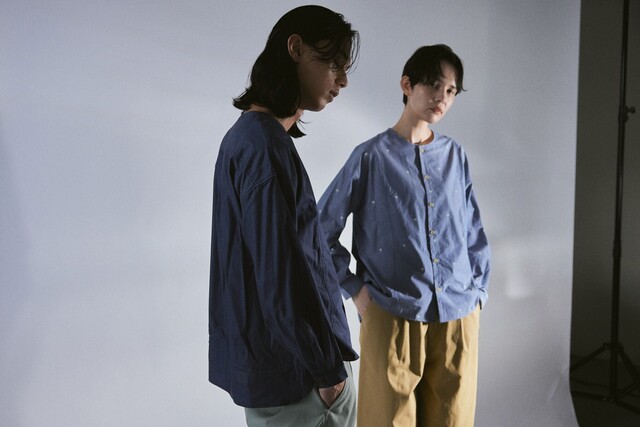 インディゴ染めのような深みのある色合いは、染色技術によって表現されたもので、デニムのような表情を持ちながらも、軽やかで柔らかな着心地が魅力です。