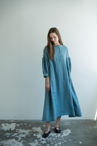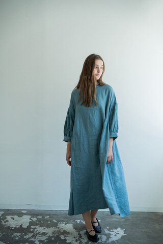 「光を味方につける上質リネン。贅沢なギャザーが優雅に揺れる、大人のための8分袖ワンピース」