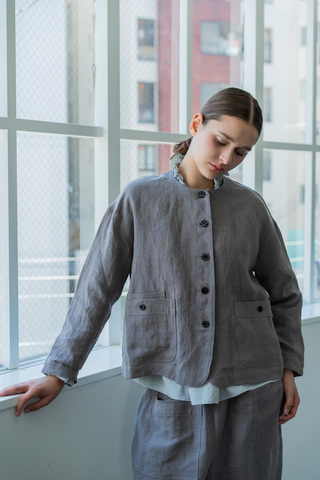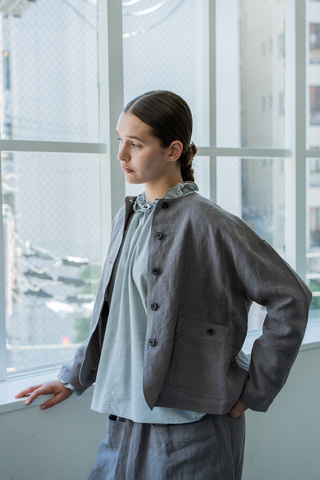 「リネンの表情を愉しむ。すっきりノーカラーで仕上げた、大人のワークジャケット」