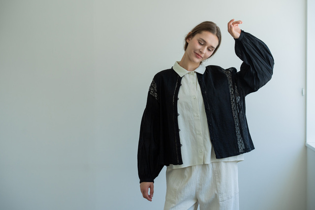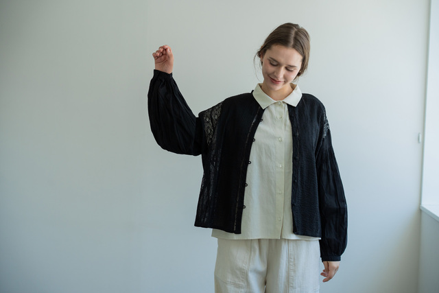 胸元にあしらわれたピンタックは、さりげなく立体感を生み出し、装いに奥行きをプラス。そこへ重なる繊細なレースが、甘くなりすぎない上品な華やかさを添えてくれます。ナチュラルな風合いの中に、女性らしい凛とした雰囲気が漂います。