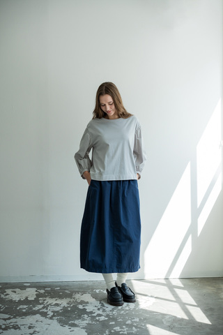 ほどよいハリとやわらかな風合いをあわせ持つコットン生地は、きれいめな印象を保ちながら、日常の装いにすっとなじみます。動くたびに生まれる自然な立体感が、シンプルなデザインに奥行きを添えてくれます。