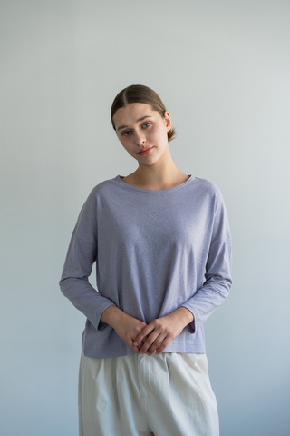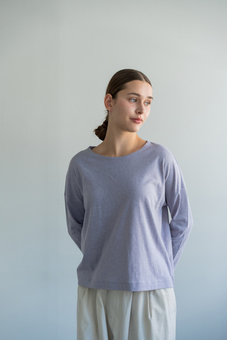 身幅にゆとりを持たせた、リラックス感のあるシルエット。肩の力を抜いて着られながら、だらしなく見えにくい絶妙なバランスに整えています。ほどよい着丈で、パンツにもスカートにも合わせやすく、タックインせずともすっきりとまとまります。