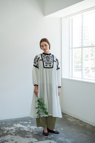 やわらかな風合いと、空気をまとうような軽やかさが魅力のワンピース。インドで織り上げられたハイカウントボイル生地を使用し、ほんのりとした透け感と自然な光沢が、上品でやさしい雰囲気を演出してくれます。