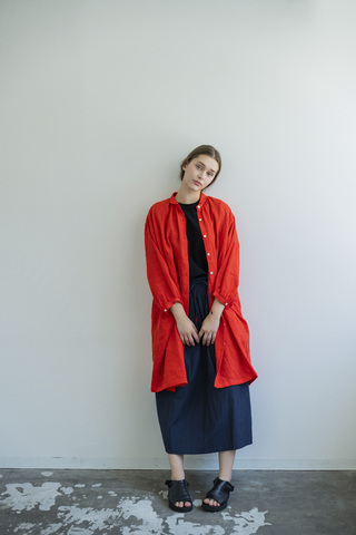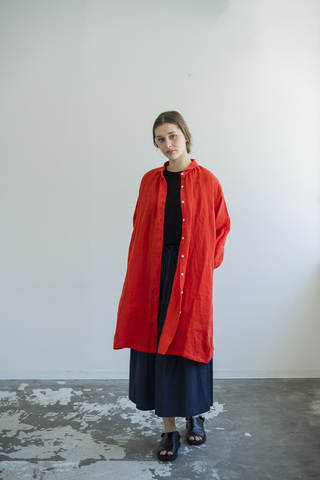 デザインのポイントは、すっきりとした細幅の衿。甘くなりすぎないシャープなラインが全体を引き締め、大人の装いにも取り入れやすいバランスに仕上げています。ゆとりのある身頃と落ち感のあるシルエットで、リラックスした着心地ながらも自然と雰囲気のあるスタイルに。
