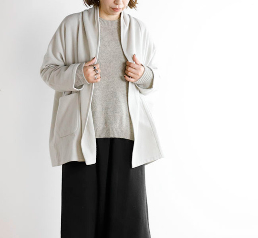 本来はニット用に使用される甘撚りの糸を織り生地に使用しました。糸が甘撚りであることにより暖かな空気を含みやすく軽い着心地です。