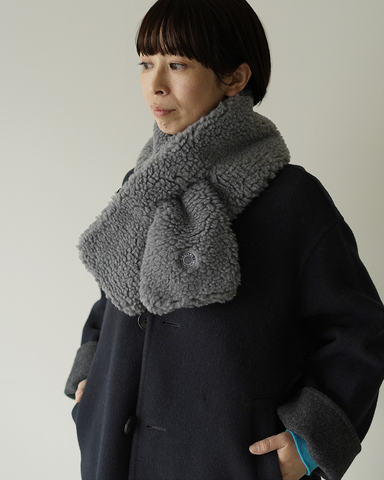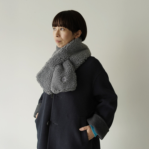凹凸のあるウールボアは柔らかく、肌当たりがよい風合いが魅力。厚すぎず軽量なので、コートの上からもバランスよく収まります。