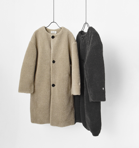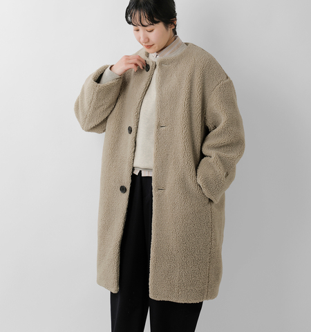 ノーカラーで仕立てた、洗練のシンプルコート。軽く柔らかなボア素材が、やさしく体を包み、動きやすさも兼ね備えています。