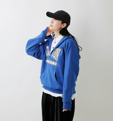 ヴィンテージのスウェットパーカーにクラッシュ加工を施し、リメイクをした1点もののパーカーです。襟はVネックのように大きく開いて、インナーとのレイヤードを楽しめます。随所にダメージ加工とペイントが施され、味わいのある古着のような雰囲気。オーバーシルエットで、ゆったりと楽に着られて、こなれ感のあるカジュアルスタイルを披露します。