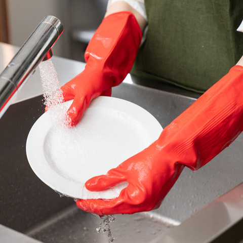 カラーはスタイリッシュなレッド。熱や刺し傷、引き裂きに強い中厚手タイプで、炊事、洗濯、掃除、園芸、洗車などあらゆる場面で重宝する丈夫なゴム手袋です。スリムで手にぴったりフィットするのに窮屈でなく、食器洗いなどの細かな作業もスムーズに行えます。