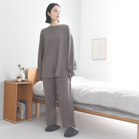 着心地が良いことはルームウェア選びで大切なポイント。こちらは、レーヨンがブレンドされていることでしっとり柔らかな肌心地。また、あたたかみのある微起毛素材で穏やかなぬくもりを感じます。