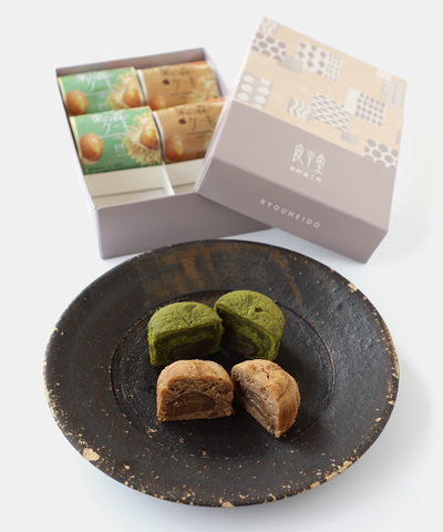 小麦粉を使わずに仕立てているため、よりなめらかで優しい口どけに。定番の「栗」と、上品な香りを添える「抹茶栗」の2種類を詰め合わせた6個入り。