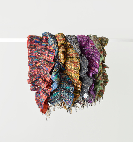 カラフルな糸玉で編み上げた、存在感のあるストール。くしゅっと波打つようにあしらわれたフリンジが、上品な立体感を演出、フランス製ならではの上質で華やかなデザインに仕上げました。