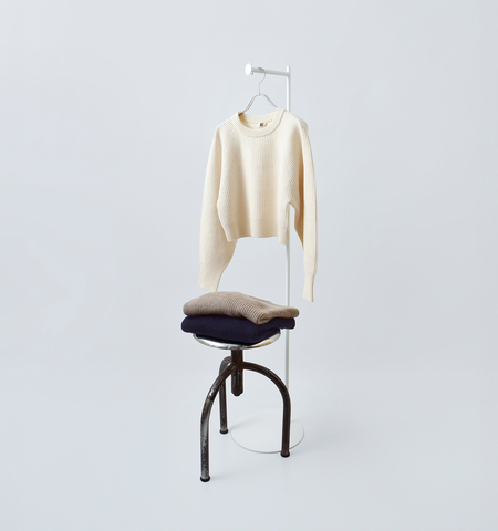 素材には、紡毛紡績で仕上げたコットン100%とエクストラファインラムウール100%をブレンドした特別な糸を使用。国内でも限られた工場でしか紡績できない希少なコットンを用い、紡毛紡績により空気を多く含むことで、軽やかでふんわりとした風合いを実現しました。膨らみやすく重くなりがちな片畦編みも、ラムウールとの組み合わせで軽く仕上げており、上質な手触りと温かさを両立した一枚です。