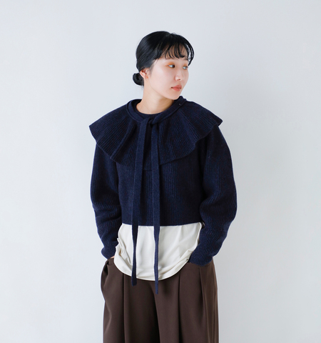 unfil(アンフィル)より、コットン エクストラファイン ラムウール リブニット プルオーバー “woolen cotton & ex.fine lambs wool ribbed-knit P/O”のご紹介です。コンパクトな着丈と、肩から袖にかけてふわりと膨らむ立体的なスリーブが印象的な一枚。バランスの取りやすい短め丈は、ボリュームのあるボトムとも合わせやすく、レイヤードスタイルもすっきり見せてくれます。素材には、軽さと柔らかな膨らみを引き出した特別なコットンとエクストラファインラムウールのミックス糸を使用。見た目以上に軽い着心地で、デイリーに気負わず纏える快適さが魅力です。同シリーズのリブニットフリルつけ襟と合わせれば、華やかなスタイリングも楽しめます。