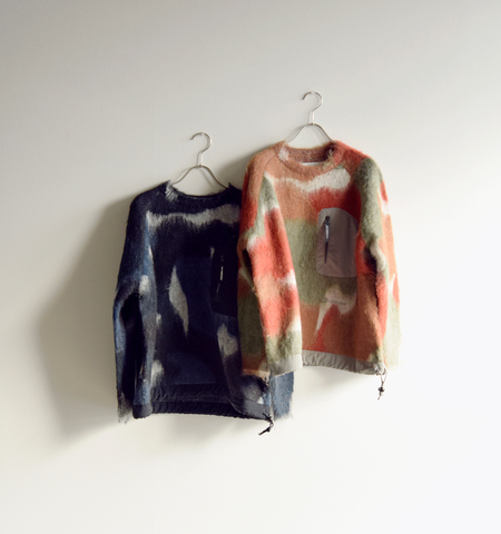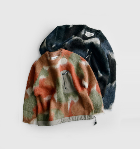 ブランドらしいカモフラージュパターンを、編み地そのもので表現。ミックスカラーが重なり合い、1枚で存在感のあるデザインに仕上がっています。