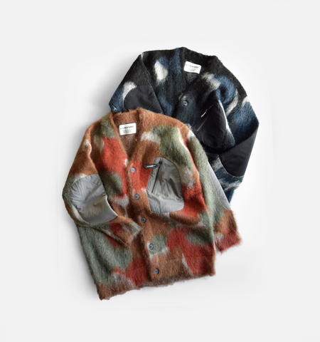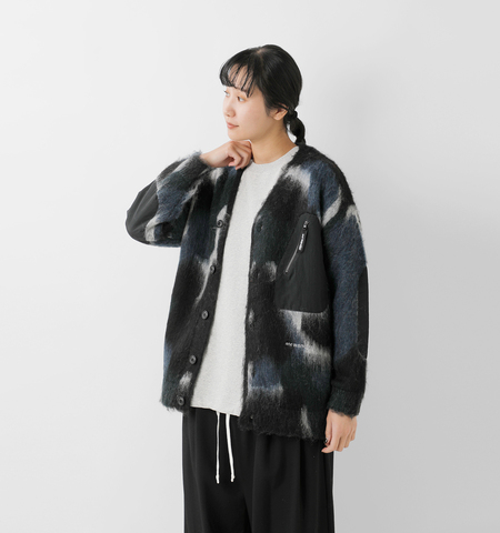 5Gのダブルジャガードで、アクリル・ナイロン・ウール・モヘヤをブレンドした糸を編み立て、ブランドオリジナルのカモフラ柄を表現したニットカーディガン。両面起毛によるふんわりとしたシャギー感が、見た目にも着心地にも柔らかな温かみをもたせています。部分使いのナイロン生地には、繊維廃棄物から再生されたナイロンを50%使用したエコ素材を採用。耐久性とサステナビリティを両立した、and wanderらしい機能的なディテールです。フロントはカーディガンならではの前開き仕様で、レイヤードの幅を広げてくれるデザイン。胸ポケットやナイロン切り替えがアクセントになり、街でもアウトドアシーンでも活躍する1枚に仕上がっています。