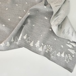 森の風景を切り取った絵柄が可愛らしいおくるみ、よく見ると表面がぽこぽこしています。