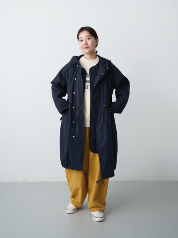 暖かいけれど、動きを邪魔しないミドル丈のアウターコート。ウエストの内側と裾には、ドローコードが通っていて、シルエットの変化を楽しめるとともに、防寒対策にも役立つ工夫になっています◎