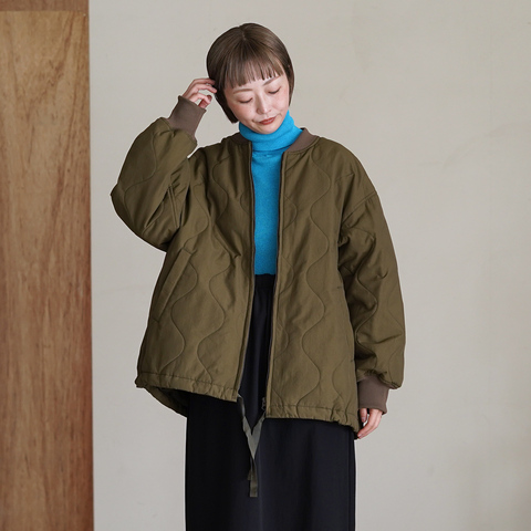 洗い加工を施したナイロンタッサー生地は、軽さと自然な風合いが魅力で、デイリーに羽織りやすい仕上がり。中綿入りであたたかく、裏地付きで冷気を通しにくいため、寒い季節の外出にも心強い一枚です。