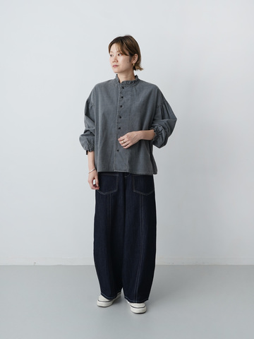 ギャザーフリルのやや立ち上がった襟と、シャーリング出来るゴムギャザーの袖がポイントのブラウス、味のあるシャンブレー生地と甘さのデザインがバランスの取れた一着です。