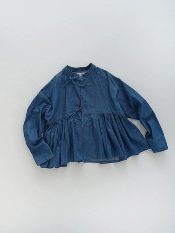 緩やかに落ちた肩のラインとややゆとりのある身幅、太すぎない袖のバランスが絶妙です。リボンで留めて一枚で着るのはもちろんTシャツやワンピースに袖を捲ってラフに羽織るだけでもこなれた雰囲気に。