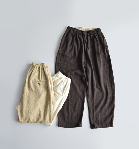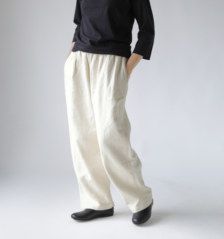 ゆったりとしたシルエットと、くたっと落ちる生地の質感により、纏うほどに身体になじみ、心までほぐれていくような一本です。日々の装いに、手のぬくもりと静けさを添えてくれます。