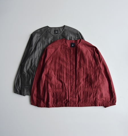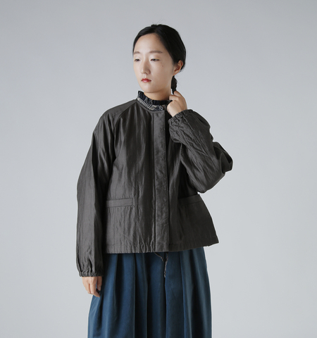 手織りのコットンシルク素材を使用し、中綿を入れずにコットンの生地を1枚挟んだ薄手で軽いキルティングのコートです。シルク特有の光沢感があり、上品な雰囲気を醸し出し、モノトーンになりがちな秋冬スタイルに華やかなニュアンスを添えてくれます。