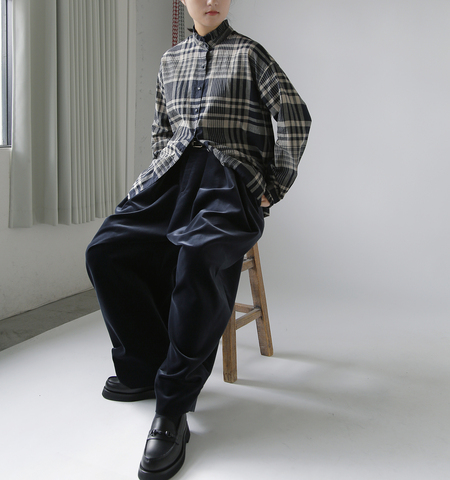 柔らかな落ち感とドレープ感が優雅な印象のベルベットを使用したワイドパンツです。裾に向かってカーブした丸いシルエットですので、ワイドながら収まりの良いシルエットとなっています。クラシカルな生地を使用しながらも、クリーンなディテールはモダンな印象を与えますので、上質で洗練されたスタイルへ導いてくれます。