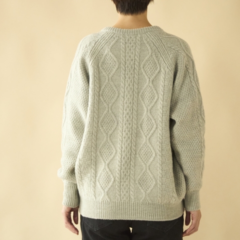 こちらは、アラン柄を前身・後身・袖すべてにデザインしたニットです。アラン柄とは、アイルランドにあるアラン諸島発祥の模様で、モチーフとして、網やダイヤモンドハニカム(蜂の巣)などが用いられます。