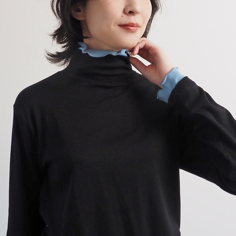 まるでインナーを重ねているような配色タートルネックが主役。内側からふんわりと覗くフリルが、顔まわりにニュアンスをプラスします。