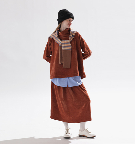 シャーリングゴム仕様のウエストで、好きな位置にフィット。トップスやボトムスとの重ね着もスムーズにでき、ストレスのない着用感です。