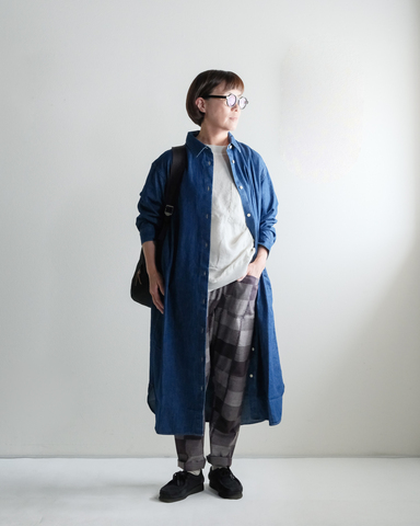 伝統的なもんぺの要素を活かしながらも、現代の暮らしに取り入れやすいようリデザインされたうなぎの寝床の現代風もんぺ。