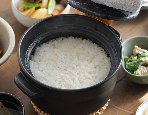 土鍋は熱伝導率が低く、加熱すると緩やかに温度が上昇するため、お米そのものの甘みをじっくり引き出し、ふっくらとツヤのある、おいしいごはんに仕上げてくれます。
