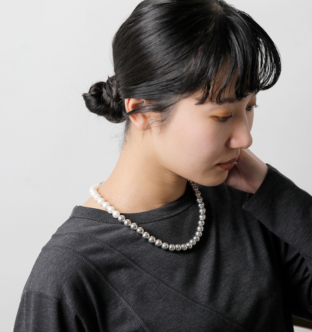 艷やかなメタリック中空ボールと、淡水パール柔らかな輝きが絶妙に調和したネックレス。大きめのサイズで揃えた存在感のあるネックレスはコーデのアクセントにぴったり。