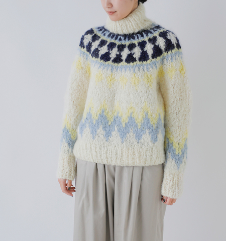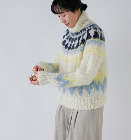 unfil(アンフィル)より、モヘアブレンド ハンドニット ハイネック プルオーバー “mohair blend hand-knit high-neck P/O”のご紹介です。イギリスのロイヤルなカラーリングをイメージしたクラシックなノルディック柄のプルオーバーです。大きな求心編みが特徴で、vintageライクでありながら、他にはないアイテムです。